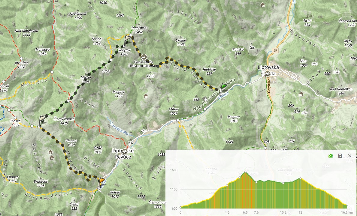 Trasa piesza: Hájovňa pred Teplou dolinou (633m) – Rakytov (1567m) –Sedlo Ploskej (1396m) – Vyšná Revúca (705m)